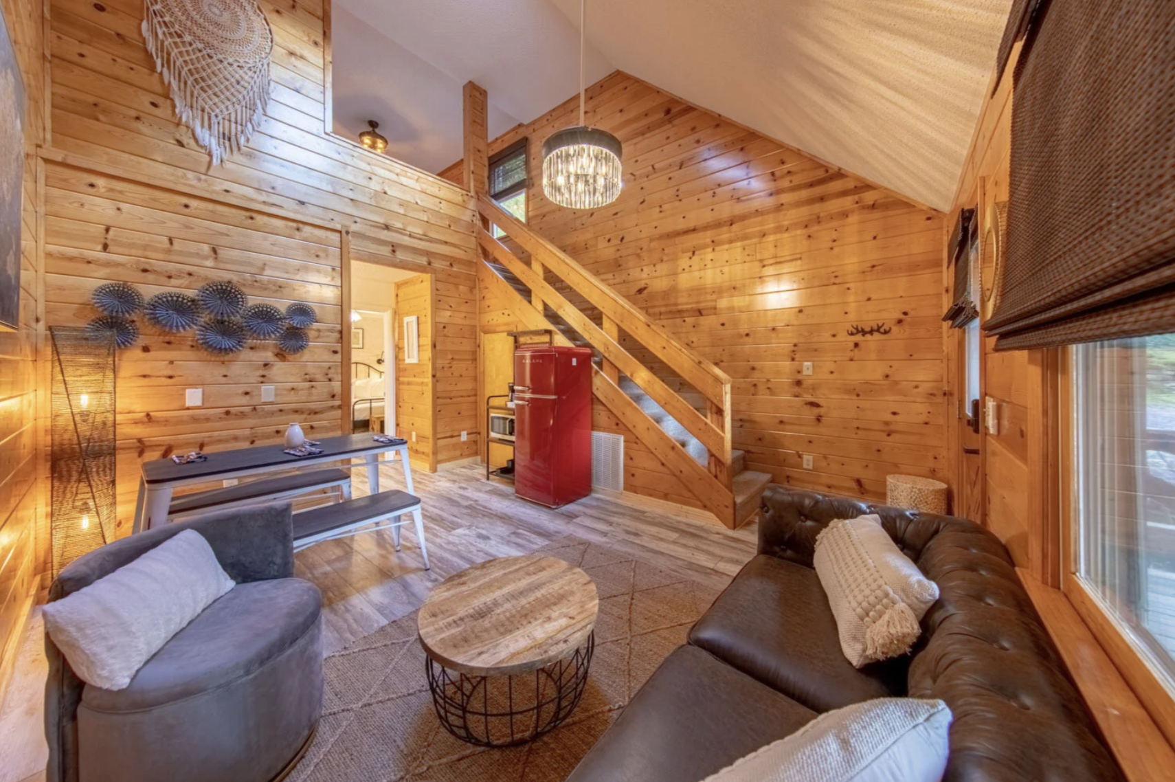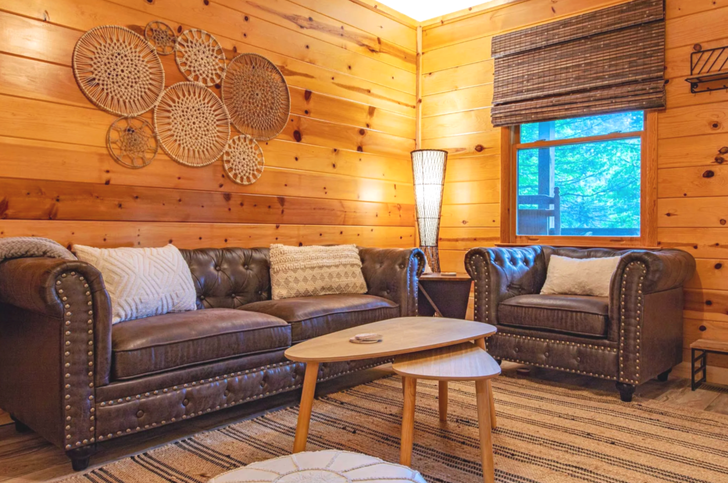 Forest porch, plush living room, queen bedroom and ensuite bath